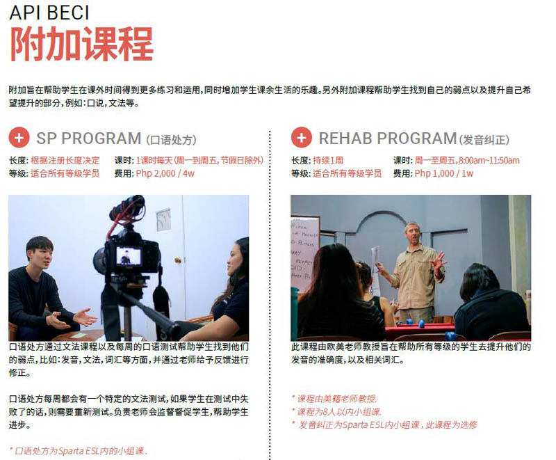 斯巴达ESL课程是为不同级别的ESL学习者提供的强化课程。 它更偏重于在学生留校期间提高学生 口说能力。 该课程适合被动学习状态的学员。它专注于在短时间内提高他们的口语能力。 这是一个结构和管理课程,以便让学生尽快进步。此外,还为具有不同英语水平的学生提供不同的小组课程,这将有助于迅速提高英语熟练水平。 此外,斯巴达ESL课程通过口语处方SP专注于纠正每个学生错误表达,错误文法,错误发音等。 还会有一周的专业发音课程,专注于通过Rehab(发音校正)课程来帮助纠正学生的发音问题。