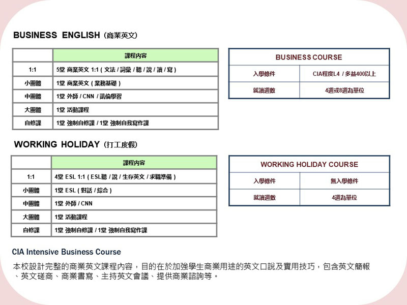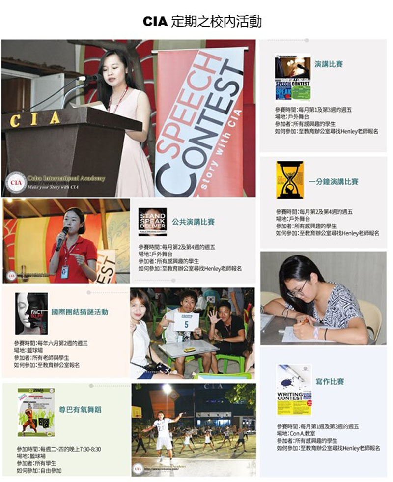 CIA的团体课内容非常丰富,比如演讲、美式发音训练、电影焦点、音乐、流行的英语词汇或商业英语等活动。 学校也严格执行EOP (English Only Policy)制度,帮助学员创造良好的英语学习环境。