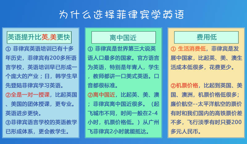 众多学子从英国、美国、加拿大、澳大利亚游学之后,越来越多的人选择到菲律宾学英语。一方原因是:价格便宜;另一方面是:大量一对一授课和团课,能够帮助学生能够快速提升口语能力,是吸引学员到菲律宾的主要因素。